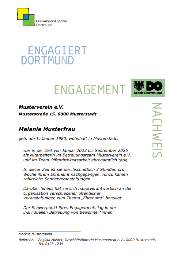 zur Dokumentation und Bescheinigung fachlicher und sozialer Kompetenzen, sowie im Ehrenamt erworbener Fähigkeiten. Solch ein Nachweis zeigt vor allem beruflichen Nutzen, denn immer mehr Unternehmen legen bei ihrer Personalauswahl großen Wert auf das soziale und ehrenamtliche Engagement ihrer Mitarbeiter*innen. So kann ein Engagementnachweis ein ausschlaggebendes Kriterium bei Einstellungen sein! Der Nachweis kann von den Organisationen per Mail bei der FreiwilligenAgentur (freiwilligenagentur@dortmund.de) angefragt werden.